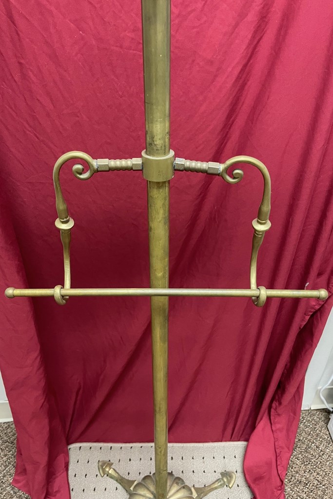 Vintage Brass Gentlemen’s Valet Caddy Coat Rack - This item is 58" high and is solid brass and is a definite conversation piece. This is a used item so it has some degree of wear and tear, but functions as it should. There is an area (see last picture) that has come loose, but it can be fixed. If you would like to come to our office location to view item prior to purchase you may do so by contacting us via email rld@healingwings.com or office phone: (303) 789-0950 or Cell: (720)-955-0546. **This item is for local (Denver Areas) pickup only!